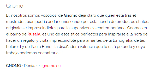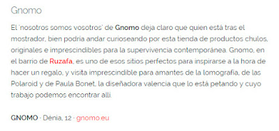 "Gnomo, en el barrio de Ruzafa, es uno de esos sitios perfectos para inspirarse a la hora de hacer un regalo, y visita imprescindible para amantes de la lomografía, de las Polaroid y de Paula Bonet."