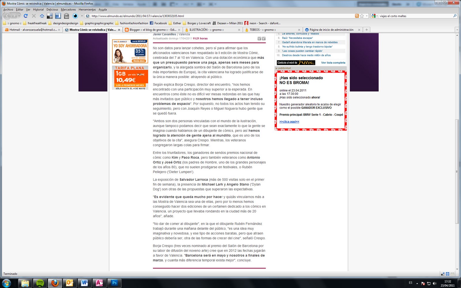 "Y como actividades curiosas reseñó la actividad que protagonizará Rubén Fernández, titulada No dar de comer al dibujante, y que consistirá en permanecer tres mañanas (sic) en el escaparate de la librería (sic) Gnomo dibujando delante del público."